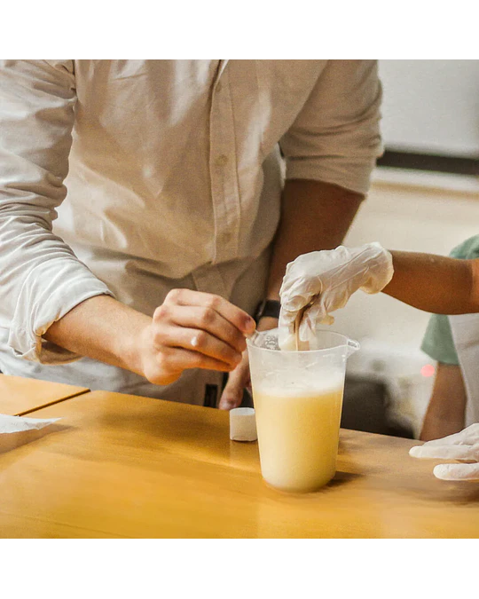 Inclui: livro de instruções, óculos de proteção, luvas, copo medidor 500mL, espátula, corante (2x), perfume (2x), ProtEcoX (2x), Eco Sabão (2x)