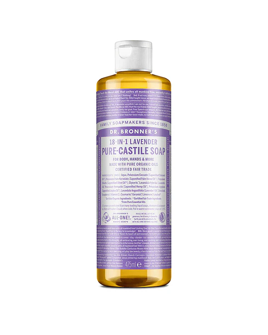 Os Sabonetes Biológicos de Castela 18-em-1 Dr. Bronner’s são bons para a generalidade das tarefas de limpeza. Rosto, corpo, cabelo & alimentos, loiça, roupa, chão, animais de estimação — limpe a sua casa e o seu corpo sem conservantes, detergentes ou agentes espumantes sintéticos.